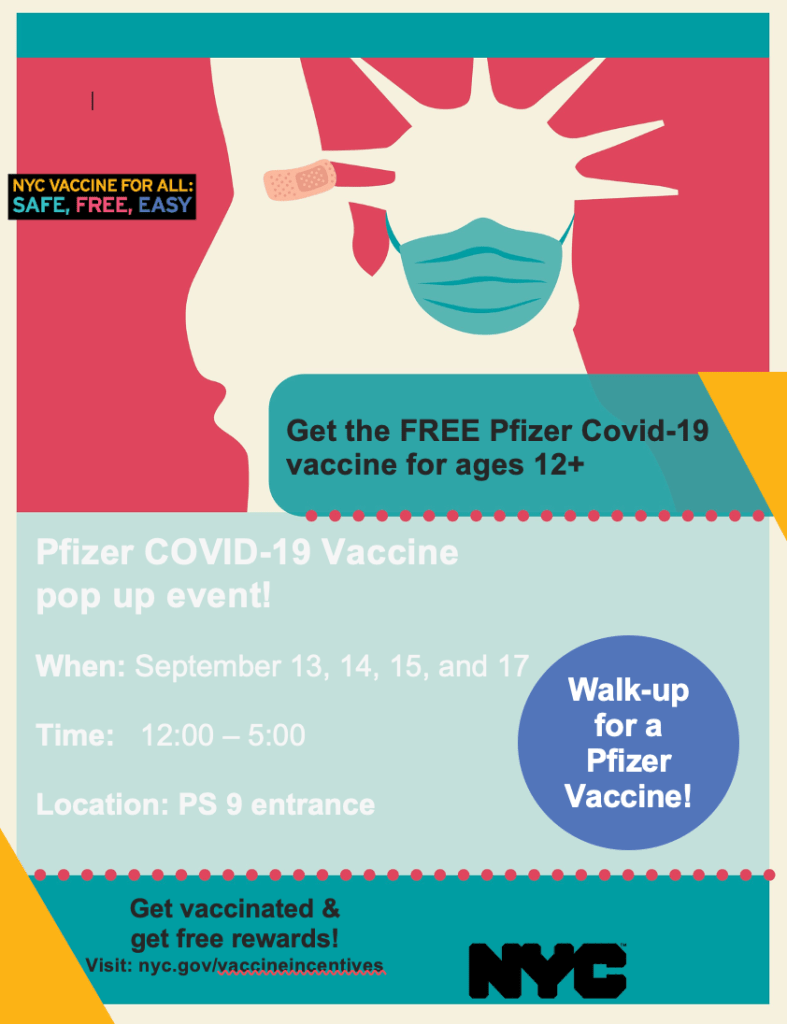 Vaccine Available at School 9/13, 14, 15, 17 Posted byarispuenteSeptember 11, 2021Posted inPTA News Share this: Click to share on Facebook (Opens in new window) Facebook Click to share on X (Opens in new window) X Like Loading... Related
