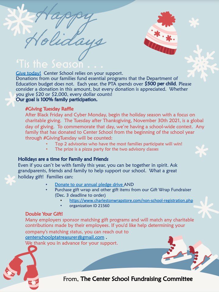 Giving Tuesday, 11/30/21 Posted bybacegrooveNovember 27, 2021Posted inGiving, PTA News Please consider a donation to The Center School for Giving Tuesday. See the attached flyer for details. Have a lovely Thanksgiving holiday. cs-givingtuesday-2021Download Share this: Click to share on Facebook (Opens in new window) Facebook Click to share on X (Opens in new window) X Like Loading... Related