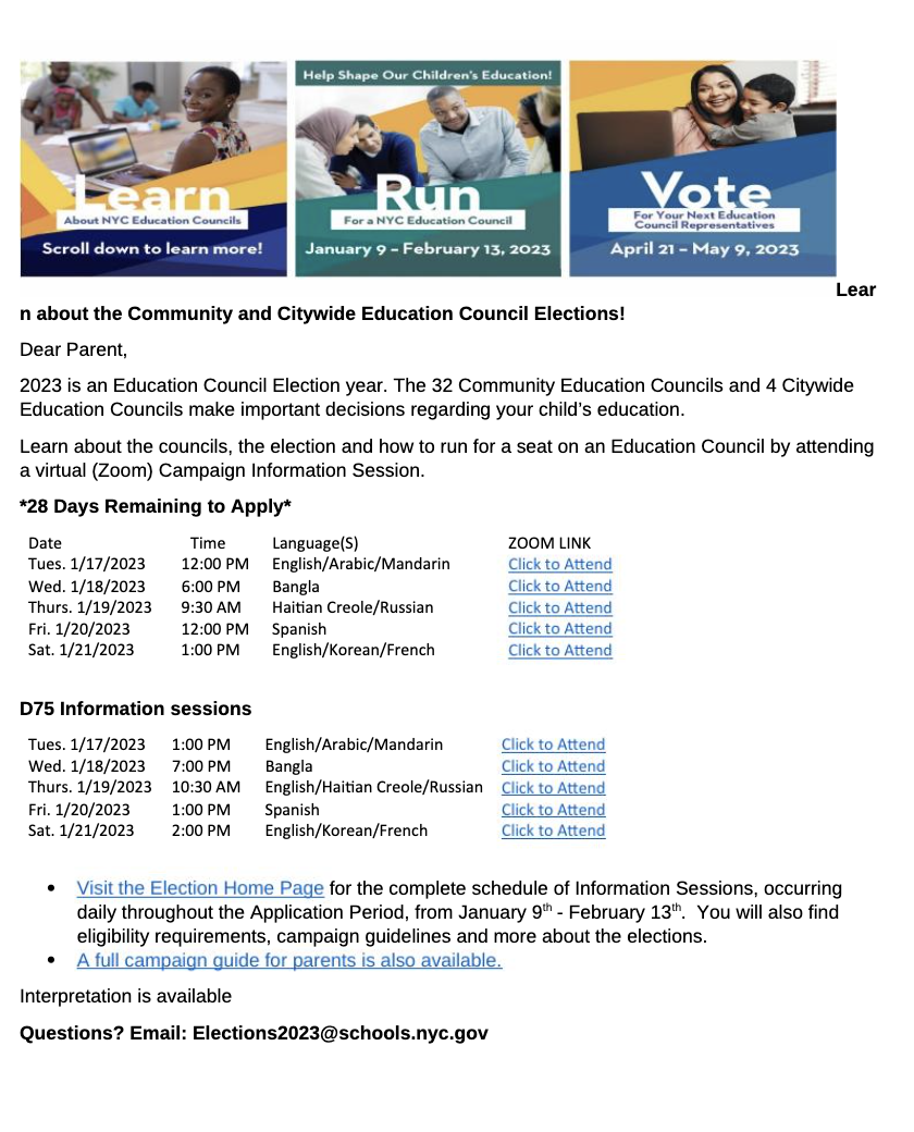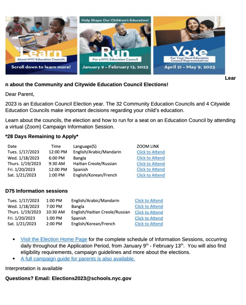 1/17/23 CEC Elections Posted bybacegrooveJanuary 17, 2023Posted inDOE Share this: Click to share on Facebook (Opens in new window) Facebook Click to share on X (Opens in new window) X Like Loading... Related